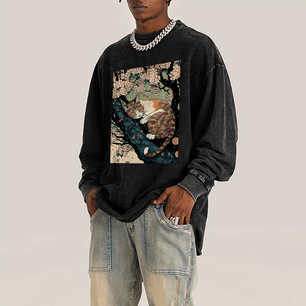 Sleeping Cat Deep Washed Vintage Long Sleeves T-Shirt