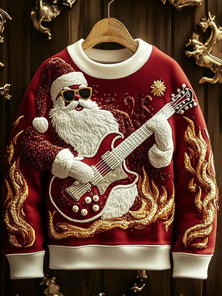 Men's Santa Claus Playing Guitar And Singing Christmas Songs Flame Embroidery Print Casual Sweatshirt